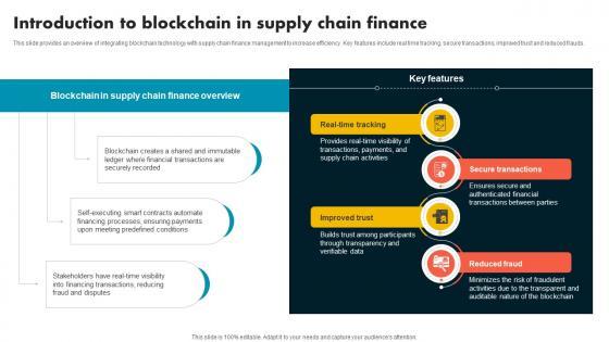 This slide provides an overview of integrating blockchain technology with supply chain finance management to increase efficiency. Key features include real time tracking, secure transactions, improved trust and reduced frauds. Slidegeeks is here to make your presentations a breeze with Introduction To Blockchain In Supply Chain Finance Supply Chain Evolution Harnessing The Power BCT SS V With our easy-to-use and customizable templates, you can focus on delivering your ideas rather than worrying about formatting. With a variety of designs to choose from, you are sure to find one that suits your needs. And with animations and unique photos, illustrations, and fonts, you can make your presentation pop. So whether you are giving a sales pitch or presenting to the board, make sure to check out Slidegeeks first This slide provides an overview of integrating blockchain technology with supply chain finance management to increase efficiency. Key features include real time tracking, secure transactions, improved trust and reduced frauds.