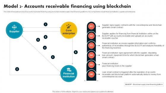 This slide showcases process of accounts receivable financing using blockchain enabled supply chain financing platforms. Key components include financial institution, supplier and enterprise. Are you in need of a template that can accommodate all of your creative concepts This one is crafted professionally and can be altered to fit any style. Use it with Google Slides or PowerPoint. Include striking photographs, symbols, depictions, and other visuals. Fill, move around, or remove text boxes as desired. Test out color palettes and font mixtures. Edit and save your work, or work with colleagues. Download Model 2 Accounts Receivable Financing Using Supply Chain Evolution Harnessing The Power BCT SS V and observe how to make your presentation outstanding. Give an impeccable presentation to your group and make your presentation unforgettable. This slide showcases process of accounts receivable financing using blockchain enabled supply chain financing platforms. Key components include financial institution, supplier and enterprise.
