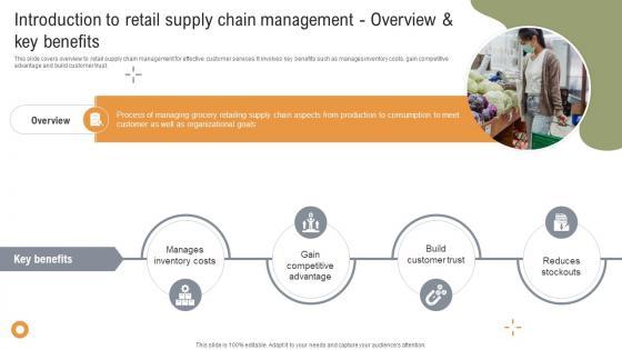 This slide covers overview to retail supply chain management for effective customer services. It involves key benefits such as manages inventory costs, gain competitive advantage and build customer trust. This Implementing Strategies To Enhance Introduction To Retail Supply Chain Management Overview is perfect for any presentation, be it in front of clients or colleagues. It is a versatile and stylish solution for organizing your meetings. The Implementing Strategies To Enhance Introduction To Retail Supply Chain Management Overview features a modern design for your presentation meetings. The adjustable and customizable slides provide unlimited possibilities for acing up your presentation. Slidegeeks has done all the homework before launching the product for you. So, do not wait, grab the presentation templates today This slide covers overview to retail supply chain management for effective customer services. It involves key benefits such as manages inventory costs, gain competitive advantage and build customer trust.
