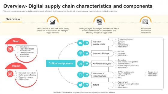 This slide presents an overview of digital supply network to effectively digitize supply chain functions. It includes overview, characteristics, and critical components.If your project calls for a presentation, then Slidegeeks is your go-to partner because we have professionally designed, easy-to-edit templates that are perfect for any presentation. After downloading, you can easily edit Overview Digital Supply Chain Characteristics And Optimizing Retail Operations With Digital DT SS V and make the changes accordingly. You can rearrange slides or fill them with different images. Check out all the handy templates This slide presents an overview of digital supply network to effectively digitize supply chain functions. It includes overview, characteristics, and critical components.