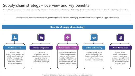 Purpose of this slide is to provide an overview about supply chain strategy. It also includes information about key benefits of having an effective strategy. Benefits covered are end to end visibility, product innovation, understanding customer needs etc.Welcome to our selection of the Supply Chain Strategy Overview And Key Benefits Stand Out Digital Supply Chain Tactics Enhancing Background PDF. These are designed to help you showcase your creativity and bring your sphere to life. Planning and Innovation are essential for any business that is just starting out. This collection contains the designs that you need for your everyday presentations. All of our PowerPoints are 100 precent editable, so you can customize them to suit your needs. This multi-purpose template can be used in various situations. Grab these presentation templates today