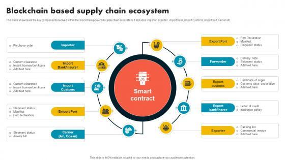 This slide showcases the key components involved within the blockchain powered supply chain ecosystem. It includes importer, exporter, import bank, import customs, import port, carrier etc. Slidegeeks is here to make your presentations a breeze with Blockchain Based Supply Chain Ecosystem Supply Chain Evolution Harnessing The Power BCT SS V With our easy-to-use and customizable templates, you can focus on delivering your ideas rather than worrying about formatting. With a variety of designs to choose from, you are sure to find one that suits your needs. And with animations and unique photos, illustrations, and fonts, you can make your presentation pop. So whether you are giving a sales pitch or presenting to the board, make sure to check out Slidegeeks first This slide showcases the key components involved within the blockchain powered supply chain ecosystem. It includes importer, exporter, import bank, import customs, import port, carrier etc.