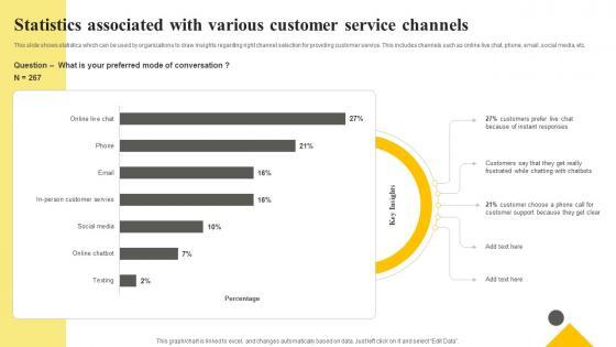 This slide shows statistics which can be used by organizations to draw insights regarding right channel selection for providing customer service. This includes channels such as online live chat, phone, email, social media, etc. Retrieve professionally designed Client Support Plan To Increase Customer Statistics Associated With Various Customer Service Strategy SS V to effectively convey your message and captivate your listeners. Save time by selecting pre-made slideshows that are appropriate for various topics, from business to educational purposes. These themes come in many different styles, from creative to corporate, and all of them are easily adjustable and can be edited quickly. Access them as PowerPoint templates or as Google Slides themes. You do not have to go on a hunt for the perfect presentation because Slidegeeks got you covered from everywhere. This slide shows statistics which can be used by organizations to draw insights regarding right channel selection for providing customer service. This includes channels such as online live chat, phone, email, social media, etc.