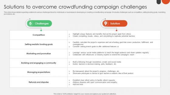 This slide shows details regarding solutions to various challenges faced by individuals or businesses in developing or creating a crowdfunding campaign. It includes challenges such as competition, setting funding goals, marketing, promotions, etc. From laying roadmaps to briefing everything in detail, our templates are perfect for you. You can set the stage with your presentation slides. All you have to do is download these easy-to-edit and customizable templates. Solutions To Overcome Crowdfunding For Nonprofits To Support Fin SS V will help you deliver an outstanding performance that everyone would remember and praise you for. Do download this presentation today. This slide shows details regarding solutions to various challenges faced by individuals or businesses in developing or creating a crowdfunding campaign. It includes challenges such as competition, setting funding goals, marketing, promotions, etc.