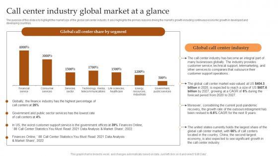 The purpose of this slide is to highlight the market size of the global call center industry. It also highlights the primary reasons driving the markets growth including continuous economic growth in developed and developing countries. Are you in need of a template that can accommodate all of your creative concepts This one is crafted professionally and can be altered to fit any style. Use it with Google Slides or PowerPoint. Include striking photographs, symbols, depictions, and other visuals. Fill, move around, or remove text boxes as desired. Test out color palettes and font mixtures. Edit and save your work, or work with colleagues. Download Call Center Industry Global Market At A Glance IT And Tech Support Business Ideas Pdf and observe how to make your presentation outstanding. Give an impeccable presentation to your group and make your presentation unforgettable. The purpose of this slide is to highlight the market size of the global call center industry. It also highlights the primary reasons driving the markets growth including continuous economic growth in developed and developing countries.