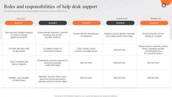 This slide tabulates the roles and responsibilities of a help desk service of different levels. Do you know about Slidesgeeks Client Feedback Strategies Roles And Responsibilities Of Help Desk Support Clipart Pdf These are perfect for delivering any kind od presentation. Using it, create PowerPoint presentations that communicate your ideas and engage audiences. Save time and effort by using our pre designed presentation templates that are perfect for a wide range of topic. Our vast selection of designs covers a range of styles, from creative to business, and are all highly customizable and easy to edit. Download as a PowerPoint template or use them as Google Slides themes. This slide tabulates the roles and responsibilities of a help desk service of different levels.