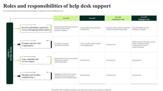 This slide tabulates the roles and responsibilities of a help desk service of different levels. There are so many reasons you need a Customer Experience Optimization Roles And Responsibilities Of Help Desk Support Guidelines PDF. The first reason is you cannot spend time making everything from scratch, Thus, Slidegeeks has made presentation templates for you too. You can easily download these templates from our website easily.