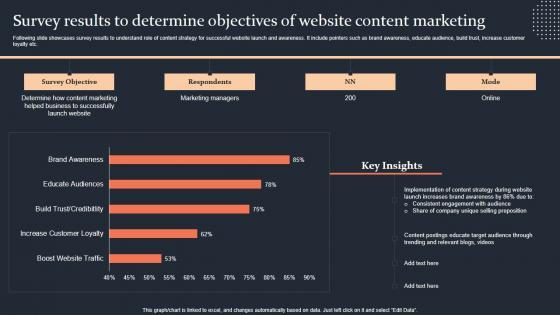 Following slide showcases survey results to understand role of content strategy for successful website launch and awareness. It include pointers such as brand awareness, educate audience, build trust, increase customer loyalty etc. Whether you have daily or monthly meetings, a brilliant presentation is necessary. Complete Guide To Launch Survey Results To Determine Objectives Of Website can be your best option for delivering a presentation. Represent everything in detail using Complete Guide To Launch Survey Results To Determine Objectives Of Website and make yourself stand out in meetings. The template is versatile and follows a structure that will cater to your requirements. All the templates prepared by Slidegeeks are easy to download and edit. Our research experts have taken care of the corporate themes as well. So, give it a try and see the results. Following slide showcases survey results to understand role of content strategy for successful website launch and awareness. It include pointers such as brand awareness, educate audience, build trust, increase customer loyalty etc.