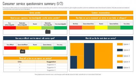 The purpose of this slide is to summarize the results customer service survey that can be used by service providers to gain insights about the customer satisfaction rate to find relevant solutions. Results provided are related to service provider and customer recommendation.Showcasing this set of slides titled Consumer Service Questionnaire Summary Survey SS The topics addressed in these templates are Moderately Unknowledgeable, Recommend Service, Experience Knowledgeable All the content presented in this PPT design is completely editable. Download it and make adjustments in color, background, font etc. as per your unique business setting. The purpose of this slide is to summarize the results customer service survey that can be used by service providers to gain insights about the customer satisfaction rate to find relevant solutions. Results provided are related to service provider and customer recommendation.