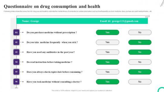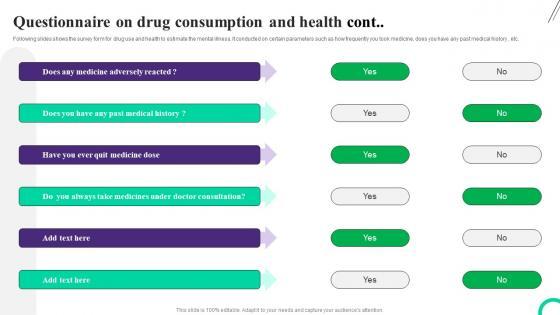 Following slides shows the survey form for drug use and health to estimate the mental illness. It conducted on certain parameters such as how frequently you took medicine, does you have any past medical history, etc. Pitch your topic with ease and precision using this Questionnaire On Drug Consumption And Health Survey SS. This layout presents information on Purchase Medicine, Medicine Frequently, Before Consuming. It is also available for immediate download and adjustment. So, changes can be made in the color, design, graphics or any other component to create a unique layout. Following slides shows the survey form for drug use and health to estimate the mental illness. It conducted on certain parameters such as how frequently you took medicine, does you have any past medical history, etc.