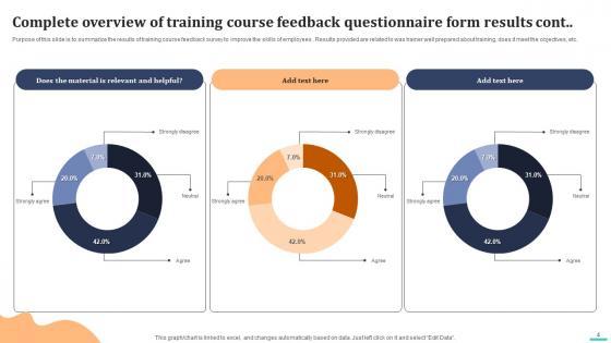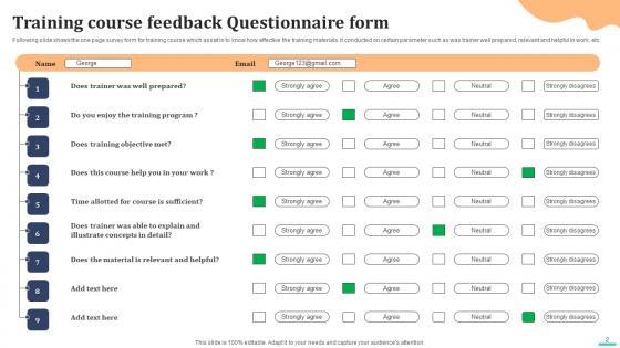 Share a great deal of information on the topic by deploying this Training Course Feedback Questionnaire Form Ppt PowerPoint Presentation Complete Deck With Slides Survey. Support your ideas and thought process with this prefabricated set. It includes a set of four slides, all fully modifiable and editable. Each slide can be restructured and induced with the information and content of your choice. You can add or remove large content boxes as well, to make this PPT slideshow more personalized. Its high-quality graphics and visuals help in presenting a well-coordinated pitch. This PPT template is also a resourceful tool to take visual cues from and implement the best ideas to help your business grow and expand. The main attraction of this well-formulated deck is that everything is editable, giving you the freedom to adjust it to your liking and choice. Changes can be made in the background and theme as well to deliver an outstanding pitch. Therefore, click on the download button now to gain full access to this multifunctional set. Our Training Course Feedback Questionnaire Form Ppt PowerPoint Presentation Complete Deck With Slides Survey are topically designed to provide an attractive backdrop to any subject. Use them to look like a presentation pro.
