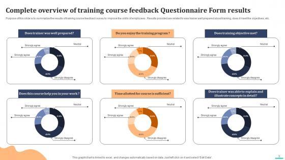 Purpose of this slide is to summarize the results of training course feedback survey to improve the skills of employees. Results provided are related to was trainer well prepared about training, does it meet the objectives, etc. Showcasing this set of slides titled Complete Overview Of Training Course Feedback Questionnaire Form Results Survey SS. The topics addressed in these templates are Training Program, Training Objective, Time Allotted. All the content presented in this PPT design is completely editable. Download it and make adjustments in color, background, font etc. as per your unique business setting. Purpose of this slide is to summarize the results of training course feedback survey to improve the skills of employees. Results provided are related to was trainer well prepared about training, does it meet the objectives, etc.