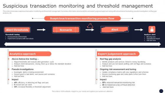 This slide showcases suspicious transaction monitoring and threshold management. It provides information about analytics and expert judgment approach along with above or below line testing, pseudo investigation, red flag gap analysis, etc. If your project calls for a presentation, then Slidegeeks is your go to partner because we have professionally designed, easy to edit templates that are perfect for any presentation. After downloading, you can easily edit Suspicious Transaction Monitoring And Threshold Management Portrait PDF and make the changes accordingly. You can rearrange slides or fill them with different images. Check out all the handy templates.