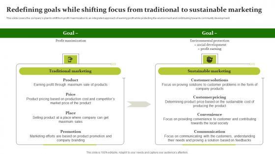 This slide covers the companys plan to shift from profit maximization to an integrated approach of earning profit while protecting the environment and contributing towards community development. Present like a pro with Environmental Marketing Redefining Goals While Shifting Focus From Traditional To Sustainable Marketing Rules PDF Create beautiful presentations together with your team, using our easy to use presentation slides. Share your ideas in real time and make changes on the fly by downloading our templates. So whether you are in the office, on the go, or in a remote location, you can stay in sync with your team and present your ideas with confidence. With Slidegeeks presentation got a whole lot easier. Grab these presentations today.