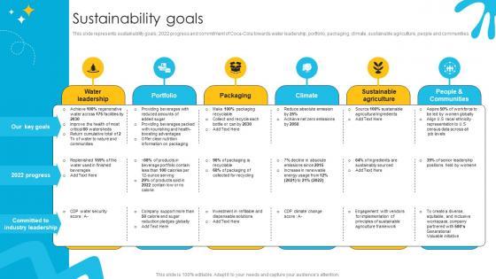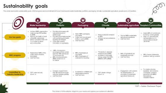 This slide represents sustainability goals, 2022 progress and commitment of Coca-Cola towards water leadership, portfolio, packaging, climate, sustainable agriculture, people and communities.Welcome to our selection of the Sustainability Goals Beverage Company Profile CP SS V. These are designed to help you showcase your creativity and bring your sphere to life. Planning and Innovation are essential for any business that is just starting out. This collection contains the designs that you need for your everyday presentations. All of our PowerPoints are 100 percent editable, so you can customize them to suit your needs. This multi-purpose template can be used in various situations. Grab these presentation templates today. This slide represents sustainability goals, 2022 progress and commitment of Coca-Cola towards water leadership, portfolio, packaging, climate, sustainable agriculture, people and communities.