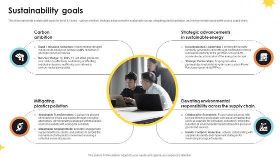 This slide represents sustainability goals for Ernst and Young carbon ambition, strategic advancement in sustainable energy, mitigating plastics pollution, and environmental responsibility across supply chain.The Sustainability Goals Professional Services And Tax Advisory Company Profile CP SS V is a compilation of the most recent design trends as a series of slides. It is suitable for any subject or industry presentation, containing attractive visuals and photo spots for businesses to clearly express their messages. This template contains a variety of slides for the user to input data, such as structures to contrast two elements, bullet points, and slides for written information. Slidegeeks is prepared to create an impression. This slide represents sustainability goals for Ernst and Young carbon ambition, strategic advancement in sustainable energy, mitigating plastics pollution, and environmental responsibility across supply chain.