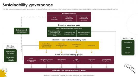 This slide represents sustainability governance hierarchy framework for Coca-Cola. It covers positions such as board of directors, executive leadership team, networked corporate sustainability team etc. Do you have to make sure that everyone on your team knows about any specific topic I yes, then you should give Sustainability Governance Liquid Refreshment Manufacturer Company Profile Ppt Presentation CP SS V a try. Our experts have put a lot of knowledge and effort into creating this impeccable Sustainability Governance Liquid Refreshment Manufacturer Company Profile Ppt Presentation CP SS V. You can use this template for your upcoming presentations, as the slides are perfect to represent even the tiniest detail. You can download these templates from the Slidegeeks website and these are easy to edit. So grab these today This slide represents sustainability governance hierarchy framework for Coca-Cola. It covers positions such as board of directors, executive leadership team, networked corporate sustainability team etc.