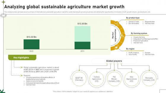 This slide provides glimpse about summary of international sustainable agriculture market for understanding its growing business and utilizing the opportunities. It includes CAGR, growth drivers, global players, etc. If your project calls for a presentation, then Slidegeeks is your go-to partner because we have professionally designed, easy-to-edit templates that are perfect for any presentation. After downloading, you can easily edit Analyzing Global Sustainable Agriculture Market Growth Adopting Sustainable Farming Techniques and make the changes accordingly. You can rearrange slides or fill them with different images. Check out all the handy templates. This slide provides glimpse about summary of international sustainable agriculture market for understanding its growing business and utilizing the opportunities. It includes CAGR, growth drivers, global players, etc.