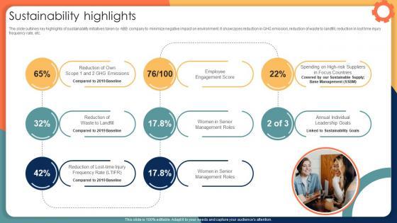 The slide outlines key highlights of sustainability initiatives taken by ABB company to minimize negative impact on environment. It showcases reduction in GHG emission, reduction of waste to landfill, reduction in lost time injury frequency rate, etc. Boost your pitch with our creative Sustainability Highlights Engineering Solution Provider Company Profile CP SS V. Deliver an awe-inspiring pitch that will mesmerize everyone. Using these presentation templates you will surely catch everyones attention. You can browse the ppts collection on our website. We have researchers who are experts at creating the right content for the templates. So you do not have to invest time in any additional work. Just grab the template now and use them. The slide outlines key highlights of sustainability initiatives taken by ABB company to minimize negative impact on environment. It showcases reduction in GHG emission, reduction of waste to landfill, reduction in lost time injury frequency rate, etc.