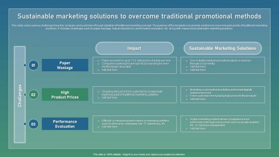 This slide covers various challenges faced by company and customers through adoption of traditional marketing concept. The purpose of this template is to provide solutions to overcome pain points of traditional marketing practices. It includes challenges such as paper wastage, high product prices, performance evaluation, etc. along with impact and sustainable marketing practices. From laying roadmaps to briefing everything in detail, our templates are perfect for you. You can set the stage with your presentation slides. All you have to do is download these easy to edit and customizable templates. Sustainable Marketing Solutions To Strategic Guide For Sustainable Brochure Pdf will help you deliver an outstanding performance that everyone would remember and praise you for. Do download this presentation today. This slide covers various challenges faced by company and customers through adoption of traditional marketing concept. The purpose of this template is to provide solutions to overcome pain points of traditional marketing practices. It includes challenges such as paper wastage, high product prices, performance evaluation, etc. along with impact and sustainable marketing practices.