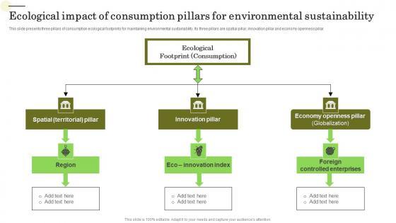 This slide presents three pillars of consumption ecological footprints for maintaining environmental sustainability. Its three pillars are spatial pillar, innovation pillar and economy openness pillar. Showcasing this set of slides titled Ecological Impact Of Consumption Pillars For Environmental Sustainability Rules Pdf The topics addressed in these templates are Ecological Footprint, Innovation Pillar, Economy Openness All the content presented in this PPT design is completely editable. Download it and make adjustments in color, background, font etc. as per your unique business setting. This slide presents three pillars of consumption ecological footprints for maintaining environmental sustainability. Its three pillars are spatial pillar, innovation pillar and economy openness pillar.