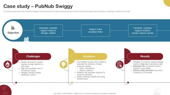 The slide illustrate case study of PubNub Swiggy to automate customer support inquiries through chatbot. It includes elements such as objectives, challenges, solutions and results. Create an editable Case Study Pubnub Swiggy Food Delivery Company Profile CP SS V that communicates your idea and engages your audience. Whether you are presenting a business or an educational presentation, pre-designed presentation templates help save time. Case Study Pubnub Swiggy Food Delivery Company Profile CP SS V is highly customizable and very easy to edit, covering many different styles from creative to business presentations. Slidegeeks has creative team members who have crafted amazing templates. So, go and get them without any delay. The slide illustrate case study of PubNub Swiggy to automate customer support inquiries through chatbot. It includes elements such as objectives, challenges, solutions and results.