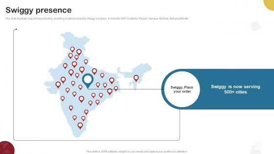 The slide illustrate map of India including providing locations served by Swiggy company. It includes 500 plus locations, Punjab, Haryana, Mumbai, Maharashtra etc. Do you know about Slidesgeeks Swiggy Presence Food Delivery Company Profile CP SS V These are perfect for delivering any kind od presentation. Using it, create PowerPoint presentations that communicate your ideas and engage audiences. Save time and effort by using our pre-designed presentation templates that are perfect for a wide range of topic. Our vast selection of designs covers a range of styles, from creative to business, and are all highly customizable and easy to edit. Download as a PowerPoint template or use them as Google Slides themes. The slide illustrate map of India including providing locations served by Swiggy company. It includes 500 plus locations, Punjab, Haryana, Mumbai, Maharashtra etc.