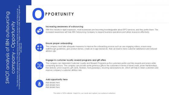 This slide shows some opportunities of IBN Outsourcing Company that that can lead to growth in future such as Increasing Awareness of Outsourcing , Ensure Proper Onboarding , Engage in Customer Loyalty Reward Programs and Gift Offers etc. The SWOT Analysis Of IBN Outsourcing Company Opportunity PPT PowerPoint SS is a compilation of the most recent design trends as a series of slides. It is suitable for any subject or industry presentation, containing attractive visuals and photo spots for businesses to clearly express their messages. This template contains a variety of slides for the user to input data, such as structures to contrast two elements, bullet points, and slides for written information. Slidegeeks is prepared to create an impression. This slide shows some opportunities of IBN Outsourcing Company that that can lead to growth in future such as Increasing Awareness of Outsourcing , Ensure Proper Onboarding , Engage in Customer Loyalty Reward Programs and Gift Offers etc.