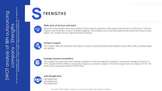 This slide shows the strengths of IBN Outsourcing Company that it has over its competitors such as Wide Array of Services and Reach , Prompt IT Support , Strategic Business Acquisitions etc. Are you searching for a SWOT Analysis Of IBN Outsourcing Company Strengths PPT Template SS that is uncluttered, straightforward, and original Its easy to edit, and you can change the colors to suit your personal or business branding. For a presentation that expresses how much effort you have put in, this template is ideal With all of its features, including tables, diagrams, statistics, and lists, its perfect for a business plan presentation. Make your ideas more appealing with these professional slides. Download SWOT Analysis Of IBN Outsourcing Company Strengths PPT Template SS from Slidegeeks today. This slide shows the strengths of IBN Outsourcing Company that it has over its competitors such as Wide Array of Services and Reach , Prompt IT Support , Strategic Business Acquisitions etc.