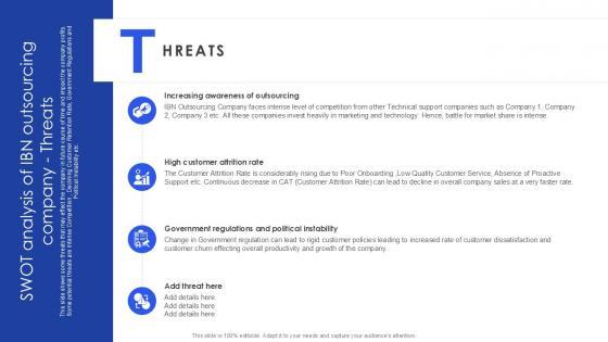 This slide shows some threats that may effect the company in future course of time and impact the company profits. Some potential threats are Intense Competition , Declining Customer Retention Rate, Government Regulations and Political Instability etc. Retrieve professionally designed SWOT Analysis Of IBN Outsourcing Company Threats PPT Presentation SS to effectively convey your message and captivate your listeners. Save time by selecting pre-made slideshows that are appropriate for various topics, from business to educational purposes. These themes come in many different styles, from creative to corporate, and all of them are easily adjustable and can be edited quickly. Access them as PowerPoint templates or as Google Slides themes. You do not have to go on a hunt for the perfect presentation because Slidegeeks got you covered from everywhere. This slide shows some threats that may effect the company in future course of time and impact the company profits. Some potential threats are Intense Competition , Declining Customer Retention Rate, Government Regulations and Political Instability etc.