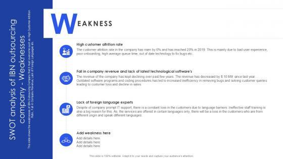 This slide shows the weaknesses of IBN Outsourcing Company that it must overcome such as High Customer Attrition Rate , Fall in Company Revenue, Lack of Foreign Languages etc. Slidegeeks has constructed SWOT Analysis Of IBN Outsourcing Company Weaknesses PPT Slide SS after conducting extensive research and examination. These presentation templates are constantly being generated and modified based on user preferences and critiques from editors. Here, you will find the most attractive templates for a range of purposes while taking into account ratings and remarks from users regarding the content. This is an excellent jumping-off point to explore our content and will give new users an insight into our top-notch PowerPoint Templates. This slide shows the weaknesses of IBN Outsourcing Company that it must overcome such as High Customer Attrition Rate , Fall in Company Revenue, Lack of Foreign Languages etc.