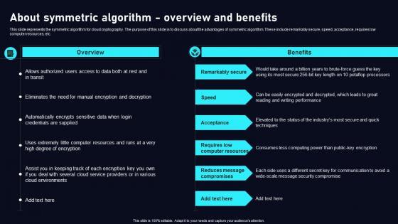 This slide represents the symmetric algorithm for cloud cryptography. The purpose of this slide is to discuss about the advantages of symmetric algorithm. These include remarkably secure, speed, acceptance, requires low computer resources, etc. From laying roadmaps to briefing everything in detail, our templates are perfect for you. You can set the stage with your presentation slides. All you have to do is download these easy-to-edit and customizable templates. About Symmetric Algorithm Overview Data Security In Cloud Computing Ppt Template will help you deliver an outstanding performance that everyone would remember and praise you for. Do download this presentation today. This slide represents the symmetric algorithm for cloud cryptography. The purpose of this slide is to discuss about the advantages of symmetric algorithm. These include remarkably secure, speed, acceptance, requires low computer resources, etc.