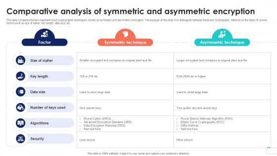 This slide compares the two important cloud cryptographic techniques, known as symmetric and asymmetric encryption. The purpose of this slide is to distinguish between these two cryptography methods on the basis of various factors such as size of cipher, key length, data size, etc. Make sure to capture your audiences attention in your business displays with our gratis customizable Comparative Analysis Of Symmetric Data Security In Cloud Computing Ppt Sample. These are great for business strategies, office conferences, capital raising or task suggestions. If you desire to acquire more customers for your tech business and ensure they stay satisfied, create your own sales presentation with these plain slides. This slide compares the two important cloud cryptographic techniques, known as symmetric and asymmetric encryption. The purpose of this slide is to distinguish between these two cryptography methods on the basis of various factors such as size of cipher, key length, data size, etc.