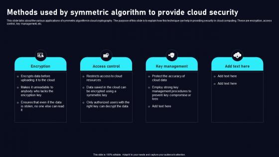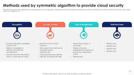 This slide talks about the various applications of symmetric algorithm in cloud cryptography. The purpose of this slide is to explain how this technique can help in providing security in cloud computing. These are encryption, access control, key management, etc. Create an editable Methods Used By Symmetric Algorithm Data Security In Cloud Computing Ppt Sample that communicates your idea and engages your audience. Whether you are presenting a business or an educational presentation, pre-designed presentation templates help save time. Methods Used By Symmetric Algorithm Data Security In Cloud Computing Ppt Sample is highly customizable and very easy to edit, covering many different styles from creative to business presentations. Slidegeeks has creative team members who have crafted amazing templates. So, go and get them without any delay. This slide talks about the various applications of symmetric algorithm in cloud cryptography. The purpose of this slide is to explain how this technique can help in providing security in cloud computing. These are encryption, access control, key management, etc.