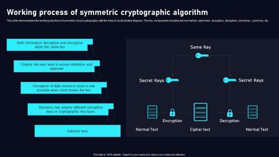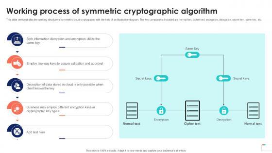 This slide demonstrates the working structure of symmetric cloud cryptography with the help of an illustrative diagram. The key components included are normal text, cipher text, encryption, decryption, secret key, same key, etc. Want to ace your presentation in front of a live audience OurWorking Process Of Symmetric Cloud Data Security Using Cryptography Download Pdf can help you do that by engaging all the users towards you. Slidegeeks experts have put their efforts and expertise into creating these impeccable powerpoint presentations so that you can communicate your ideas clearly. Moreover, all the templates are customizable, and easy to edit and downloadable. Use these for both personal and commercial use. This slide demonstrates the working structure of symmetric cloud cryptography with the help of an illustrative diagram. The key components included are normal text, cipher text, encryption, decryption, secret key, same key, etc.