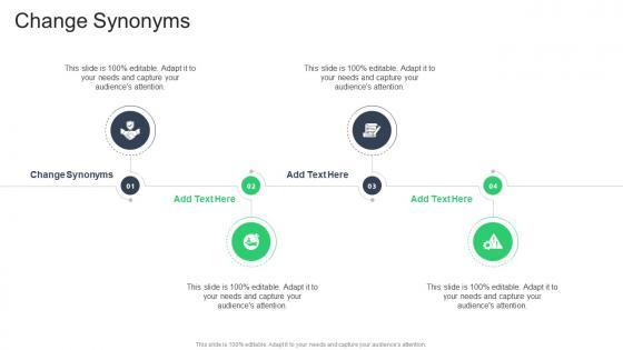 Presenting our innovatively designed set of slides titled Change Synonyms In Powerpoint And Google Slides Cpb. This completely editable PowerPoint graphic exhibits Change Synonyms that will help you convey the message impactfully. It can be accessed with Google Slides and is available in both standard screen and widescreen aspect ratios. Apart from this, you can download this well structured PowerPoint template design in different formats like PDF, JPG, and PNG. So, click the download button now to gain full access to this PPT design. Our Change Synonyms In Powerpoint And Google Slides Cpb are topically designed to provide an attractive backdrop to any subject. Use them to look like a presentation pro.