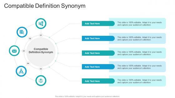 Introducing our well designed Compatible Definition Synonym In Powerpoint And Google Slides Cpb. This PowerPoint design presents information on topics like Compatible Definition Synonym. As it is predesigned it helps boost your confidence level. It also makes you a better presenter because of its high quality content and graphics. This PPT layout can be downloaded and used in different formats like PDF, PNG, and JPG. Not only this, it is available in both Standard Screen and Widescreen aspect ratios for your convenience. Therefore, click on the download button now to persuade and impress your audience. Our Compatible Definition Synonym In Powerpoint And Google Slides Cpb are topically designed to provide an attractive backdrop to any subject. Use them to look like a presentation pro.