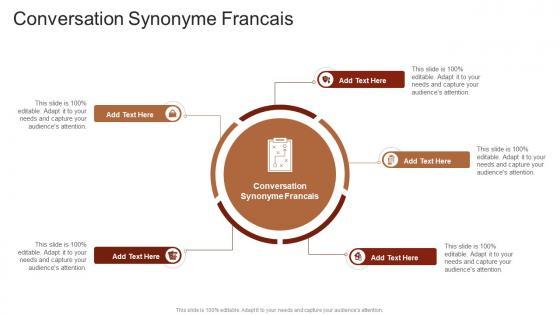 Introducing our well-designed Conversation Synonyme Francais In Powerpoint And Google Slides Cpb. This PowerPoint design presents information on topics like Conversation Synonyme Francais. As it is predesigned it helps boost your confidence level. It also makes you a better presenter because of its high-quality content and graphics. This PPT layout can be downloaded and used in different formats like PDF, PNG, and JPG. Not only this, it is available in both Standard Screen and Widescreen aspect ratios for your convenience. Therefore, click on the download button now to persuade and impress your audience. Our Conversation Synonyme Francais In Powerpoint And Google Slides Cpb are topically designed to provide an attractive backdrop to any subject. Use them to look like a presentation pro.