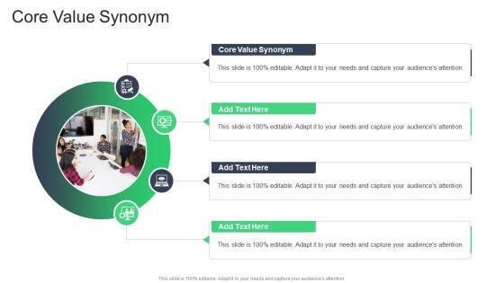 Introducing our well-designed Core Value Synonym In Powerpoint And Google Slides Cpb. This PowerPoint design presents information on topics like Core Value Synonym. As it is predesigned it helps boost your confidence level. It also makes you a better presenter because of its high-quality content and graphics. This PPT layout can be downloaded and used in different formats like PDF, PNG, and JPG. Not only this, it is available in both Standard Screen and Widescreen aspect ratios for your convenience. Therefore, click on the download button now to persuade and impress your audience. Our Core Value Synonym In Powerpoint And Google Slides Cpb are topically designed to provide an attractive backdrop to any subject. Use them to look like a presentation pro.