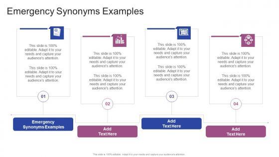 Presenting our innovatively-designed set of slides titled Emergency Synonyms Examples In Powerpoint And Google Slides Cpb. This completely editable PowerPoint graphic exhibits Emergency Synonyms Examples that will help you convey the message impactfully. It can be accessed with Google Slides and is available in both standard screen and widescreen aspect ratios. Apart from this, you can download this well-structured PowerPoint template design in different formats like PDF, JPG, and PNG. So, click the download button now to gain full access to this PPT design. Our Emergency Synonyms Examples In Powerpoint And Google Slides Cpb are topically designed to provide an attractive backdrop to any subject. Use them to look like a presentation pro.
