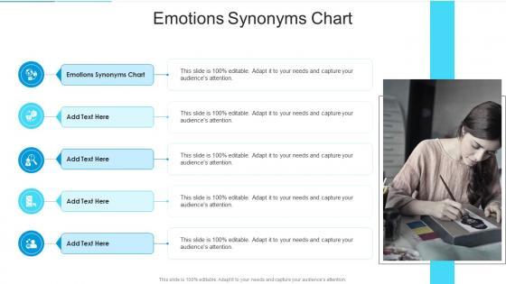 Presenting our innovatively designed set of slides titled Emotions Synonyms Chart In Powerpoint And Google Slides Cpb. This completely editable PowerPoint graphic exhibits Emotions Synonyms Chart that will help you convey the message impactfully. It can be accessed with Google Slides and is available in both standard screen and widescreen aspect ratios. Apart from this, you can download this well structured PowerPoint template design in different formats like PDF, JPG, and PNG. So, click the download button now to gain full access to this PPT design. Our Emotions Synonyms Chart In Powerpoint And Google Slides Cpb are topically designed to provide an attractive backdrop to any subject. Use them to look like a presentation pro.