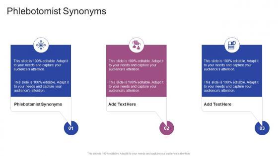 Introducing our well-designed Phlebotomist Synonyms In Powerpoint And Google Slides Cpb. This PowerPoint design presents information on topics like Phlebotomist Synonyms. As it is predesigned it helps boost your confidence level. It also makes you a better presenter because of its high-quality content and graphics. This PPT layout can be downloaded and used in different formats like PDF, PNG, and JPG. Not only this, it is available in both Standard Screen and Widescreen aspect ratios for your convenience. Therefore, click on the download button now to persuade and impress your audience. Our Phlebotomist Synonyms In Powerpoint And Google Slides Cpb are topically designed to provide an attractive backdrop to any subject. Use them to look like a presentation pro.