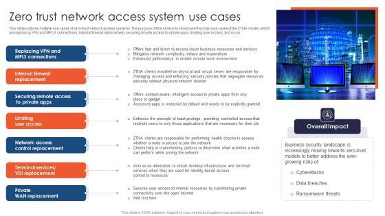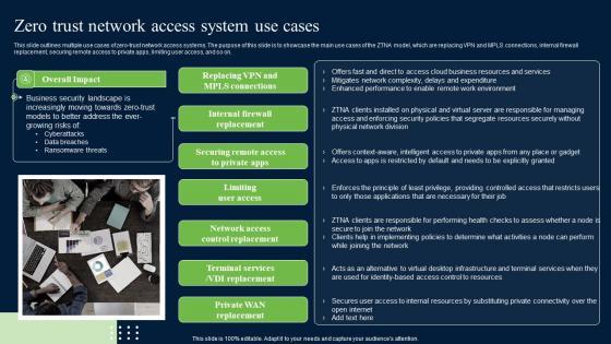 This slide outlines multiple use cases of zero-trust network access systems. The purpose of this slide is to showcase the main use cases of the ZTNA model, which are replacing VPN and MPLS connections, internal firewall replacement, securing remote access to private apps, limiting user access, and so on. Are you searching for a Zero Trust Model Zero Trust Network Access System Use Cases that is uncluttered, straightforward, and original Its easy to edit, and you can change the colors to suit your personal or business branding. For a presentation that expresses how much effort you have put in, this template is ideal With all of its features, including tables, diagrams, statistics, and lists, its perfect for a business plan presentation. Make your ideas more appealing with these professional slides. Download Zero Trust Model Zero Trust Network Access System Use Cases from Slidegeeks today. This slide outlines multiple use cases of zero-trust network access systems. The purpose of this slide is to showcase the main use cases of the ZTNA model, which are replacing VPN and MPLS connections, internal firewall replacement, securing remote access to private apps, limiting user access, and so on.