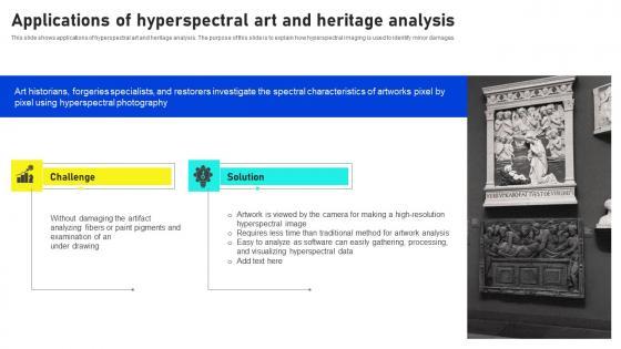 This slide shows applications of hyperspectral art and heritage analysis. The purpose of this slide is to explain how hyperspectral imaging is used to identify minor damages. Slidegeeks is one of the best resources for PowerPoint templates. You can download easily and regulate Applications Of Hyperspectral Art Hyperspectral Imaging Sensors And Systems Rules Pdf for your personal presentations from our wonderful collection. A few clicks is all it takes to discover and get the most relevant and appropriate templates. Use our Templates to add a unique zing and appeal to your presentation and meetings. All the slides are easy to edit and you can use them even for advertisement purposes. This slide shows applications of hyperspectral art and heritage analysis. The purpose of this slide is to explain how hyperspectral imaging is used to identify minor damages.