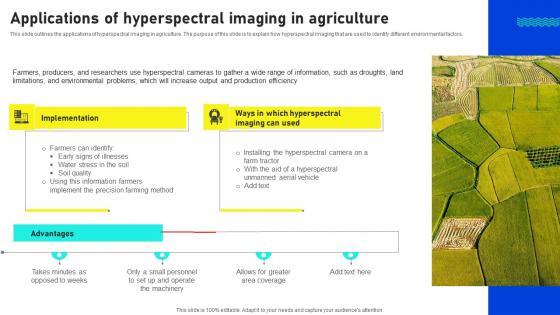 This slide outlines the applications of hyperspectral imaging in agriculture. The purpose of this slide is to explain how hyperspectral imaging that are used to identify different environmental factors. Want to ace your presentation in front of a live audience Our Applications Of Hyperspectral Imaging Hyperspectral Imaging Sensors And Systems Structure Pdf can help you do that by engaging all the users towards you. Slidegeeks experts have put their efforts and expertise into creating these impeccable powerpoint presentations so that you can communicate your ideas clearly. Moreover, all the templates are customizable, and easy to edit and downloadable. Use these for both personal and commercial use. This slide outlines the applications of hyperspectral imaging in agriculture. The purpose of this slide is to explain how hyperspectral imaging that are used to identify different environmental factors.