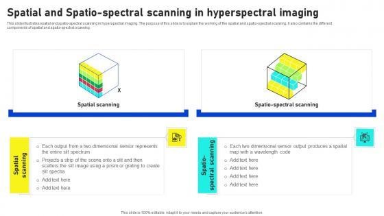 This slide illustrates spectral scanning in hyperspectral imaging. The purpose of this slide is to explain the working of the spectral scanning. It also contains the different components of spectral scanning. Presenting this PowerPoint presentation, titled Spectral Scanning In Hyperspectral Imaging Hyperspectral Imaging Sensors And Systems Demonstration Pdf, with topics curated by our researchers after extensive research. This editable presentation is available for immediate download and provides attractive features when used. Download now and captivate your audience. Presenting this Spectral Scanning In Hyperspectral Imaging Hyperspectral Imaging Sensors And Systems Demonstration Pdf. Our researchers have carefully researched and created these slides with all aspects taken into consideration. This is a completely customizable Spectral Scanning In Hyperspectral Imaging Hyperspectral Imaging Sensors And Systems Demonstration Pdf that is available for immediate downloading. Download now and make an impact on your audience. Highlight the attractive features available with our PPTs. This slide illustrates spectral scanning in hyperspectral imaging. The purpose of this slide is to explain the working of the spectral scanning. It also contains the different components of spectral scanning.
