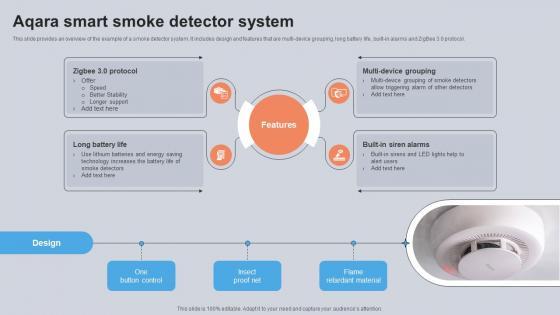This slide provides an overview of the example of a smoke detector system. It includes design and features that are multi-device grouping, long battery life, built-in alarms and ZigBee 3.0 protocol. Boost your pitch with our creative Aqara Smart Smoke Detector System Utilizing Smart Appliances IoT SS V. Deliver an awe-inspiring pitch that will mesmerize everyone. Using these presentation templates you will surely catch everyones attention. You can browse the ppts collection on our website. We have researchers who are experts at creating the right content for the templates. So you do not have to invest time in any additional work. Just grab the template now and use them. This slide provides an overview of the example of a smoke detector system. It includes design and features that are multi-device grouping, long battery life, built-in alarms and ZigBee 3.0 protocol.
