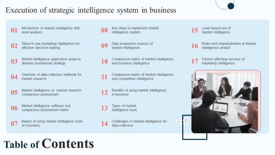Crafting an eye-catching presentation has never been more straightforward. Let your presentation shine with this tasteful yet straightforward Table Of Contents Execution Of Strategic Intelligence System In Business Download PDF template. It offers a minimalistic and classy look that is great for making a statement. The colors have been employed intelligently to add a bit of playfulness while still remaining professional. Construct the ideal Table Of Contents Execution Of Strategic Intelligence System In Business Download PDF that effortlessly grabs the attention of your audience Begin now and be certain to wow your customers Our Table Of Contents Execution Of Strategic Intelligence System In Business Download PDF are topically designed to provide an attractive backdrop to any subject. Use them to look like a presentation pro.