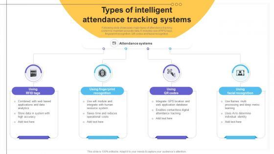 Following slide showcases major types of attendance tracking system to maintain accurate data. It includes use of RFID tags, fingerprint recognition, QR codes and facial recognition. Slidegeeks is here to make your presentations a breeze with Types Of Intelligent Attendance Tracking Systems Impact Of IoT Technology On Education IoT SS V With our easy-to-use and customizable templates, you can focus on delivering your ideas rather than worrying about formatting. With a variety of designs to choose from, you are sure to find one that suits your needs. And with animations and unique photos, illustrations, and fonts, you can make your presentation pop. So whether you are giving a sales pitch or presenting to the board, make sure to check out Slidegeeks first Following slide showcases major types of attendance tracking system to maintain accurate data. It includes use of RFID tags, fingerprint recognition, QR codes and facial recognition.
