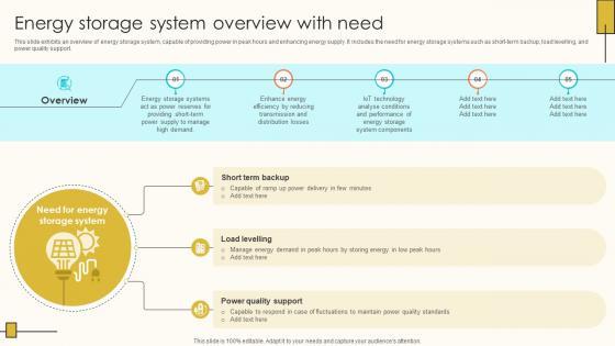 This slide exhibits an overview of energy storage system, capable of providing power in peak hours and enhancing energy supply. It includes the need for energy storage systems such as short-term backup, load levelling, and power quality support. There are so many reasons you need a Energy Storage System Overview With Need Internet Of Things Solutions To Enhance Energy IoT SS V. The first reason is you can not spend time making everything from scratch, Thus, Slidegeeks has made presentation templates for you too. You can easily download these templates from our website easily. This slide exhibits an overview of energy storage system, capable of providing power in peak hours and enhancing energy supply. It includes the need for energy storage systems such as short-term backup, load levelling, and power quality support.